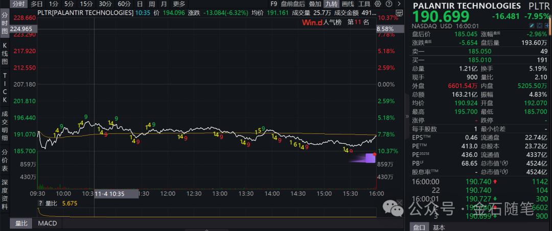 Michael Burry做空的Palantir尽管业绩爆发式增长,业绩指引超预期,但是该公司静态估值1000多倍,市盈率TTM也有449倍;而英伟达则成为历史上第一家5万亿美元巨头,比德日等国一年GDP还高。