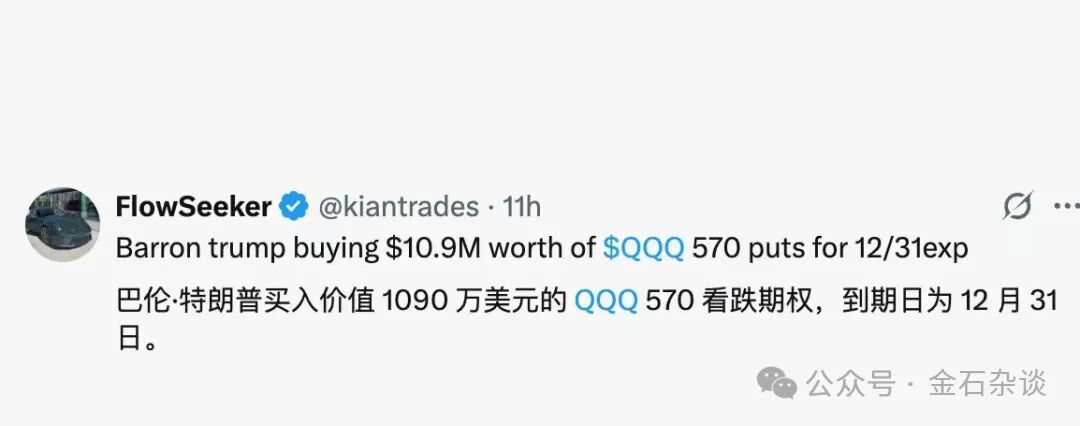 与此同时,昨晚更多的利空在美股上空萦绕。一直以内幕消息著称的川普的儿子竟然也开始看空纳指了。据最新消息,川普儿子买入价值1090万美元的看空纳指100的看跌期权,到期日12月31日,也就是还有两个月,目标价570美元,目前632美元,也就是10%左右的下跌空间。