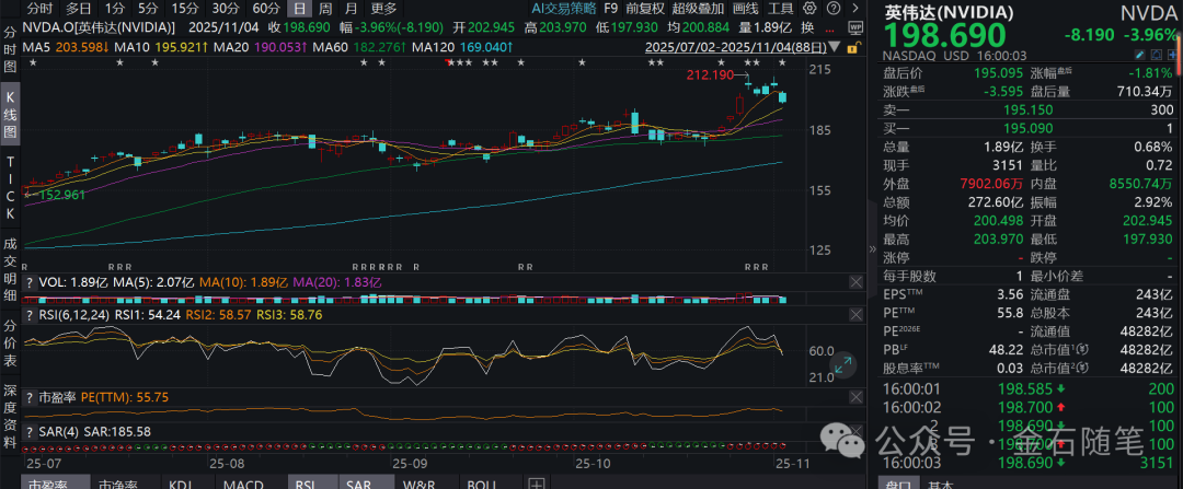 与此同时,《》原型人物Michael Burry豪掷10亿美金大举做空Palantir和英伟达。英伟达暴跌,目前股价已不足200美元,市值已不足5万亿美元。