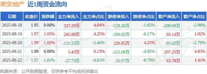 资金流向数据方面,本周荣安地产主力资金合计净流入389.64万元,游资资金合计净流出450.02万元,散户资金合计净流入60.38万元。本周资金流向一览见下表: